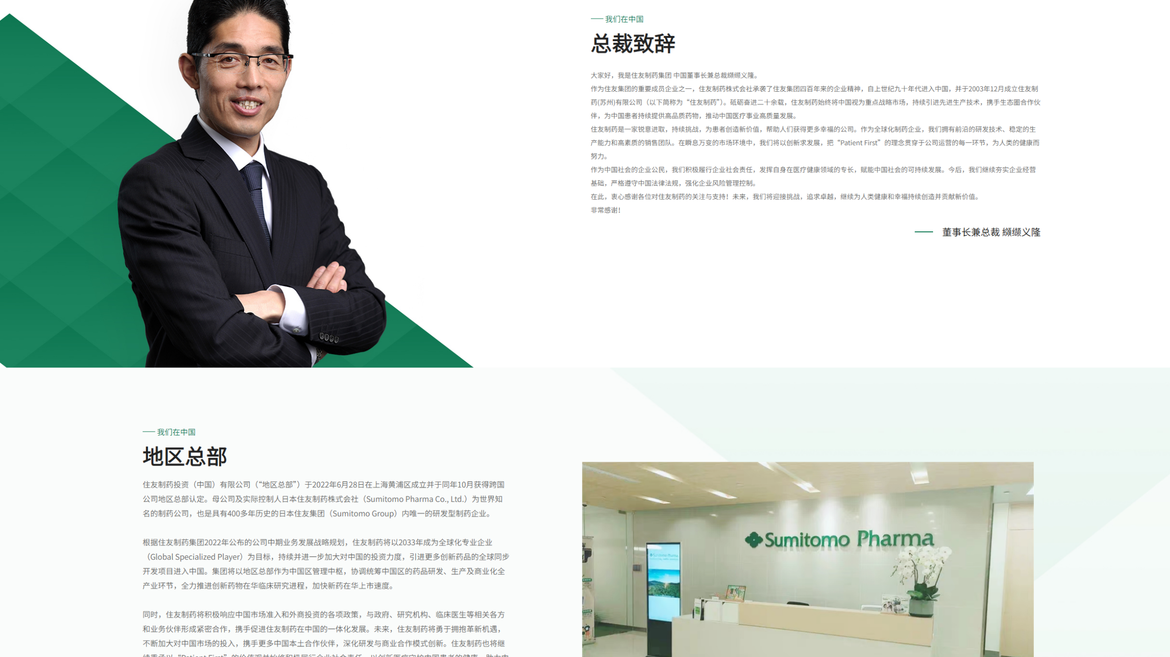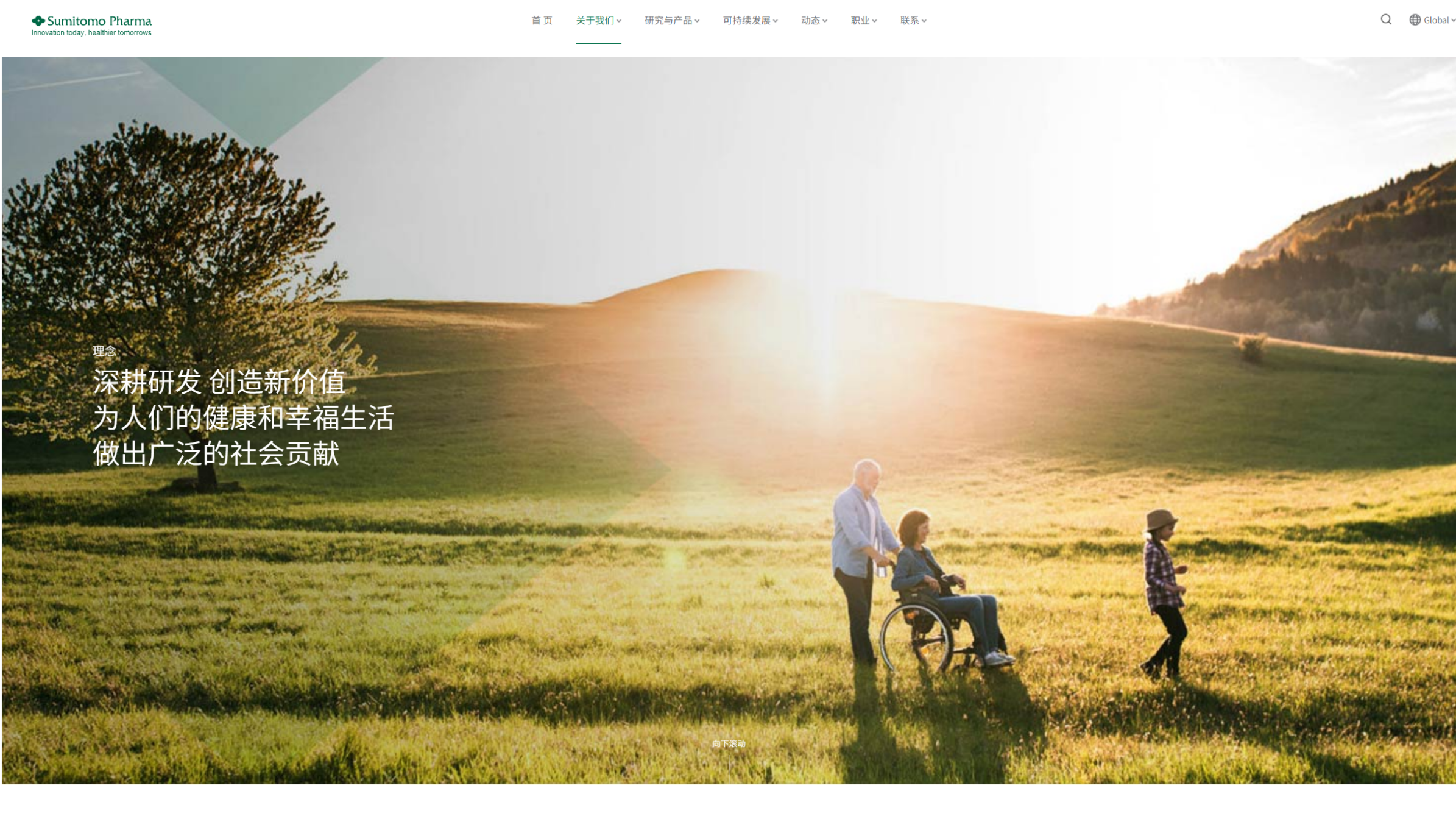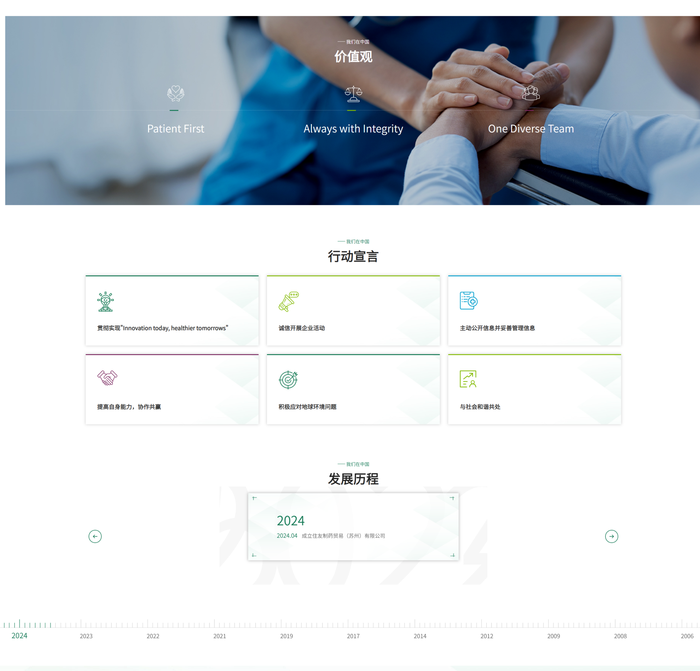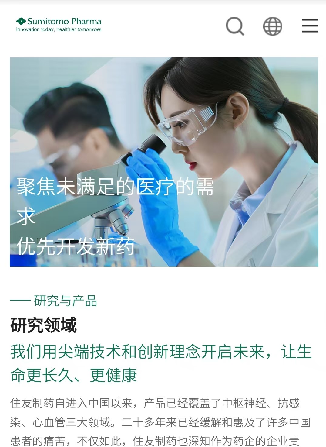 住友制药官网采用精心设计的色彩方案,以深绿色为主色调,象征着企业的专业性、可靠性以及对生命健康的深切关怀,传递出严谨的科研精神和责任感。辅以柔和的浅蓝色,增添了温暖与人文关怀,体现了公司以患者为中心、提供个性化治疗方案的使命。
