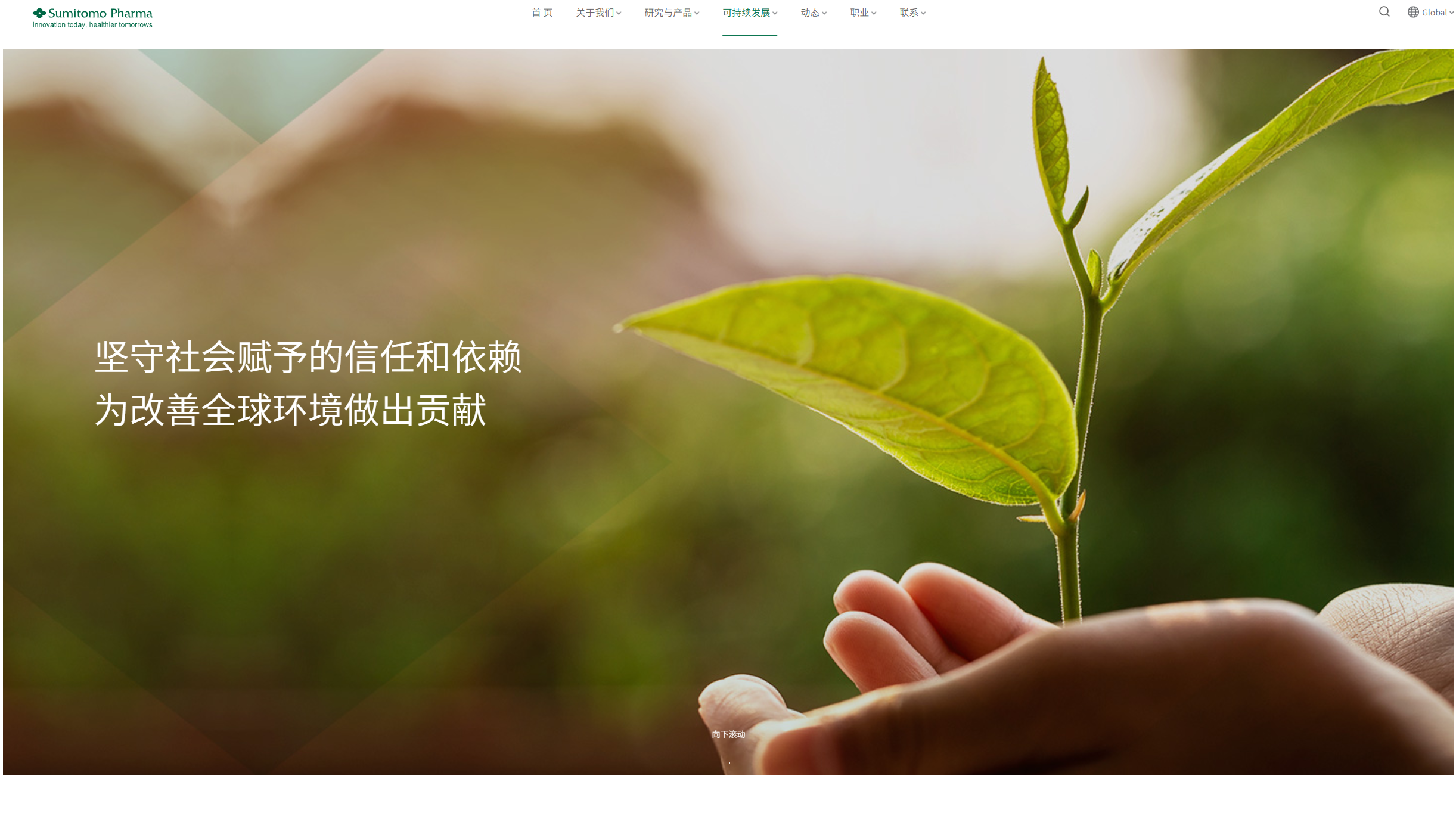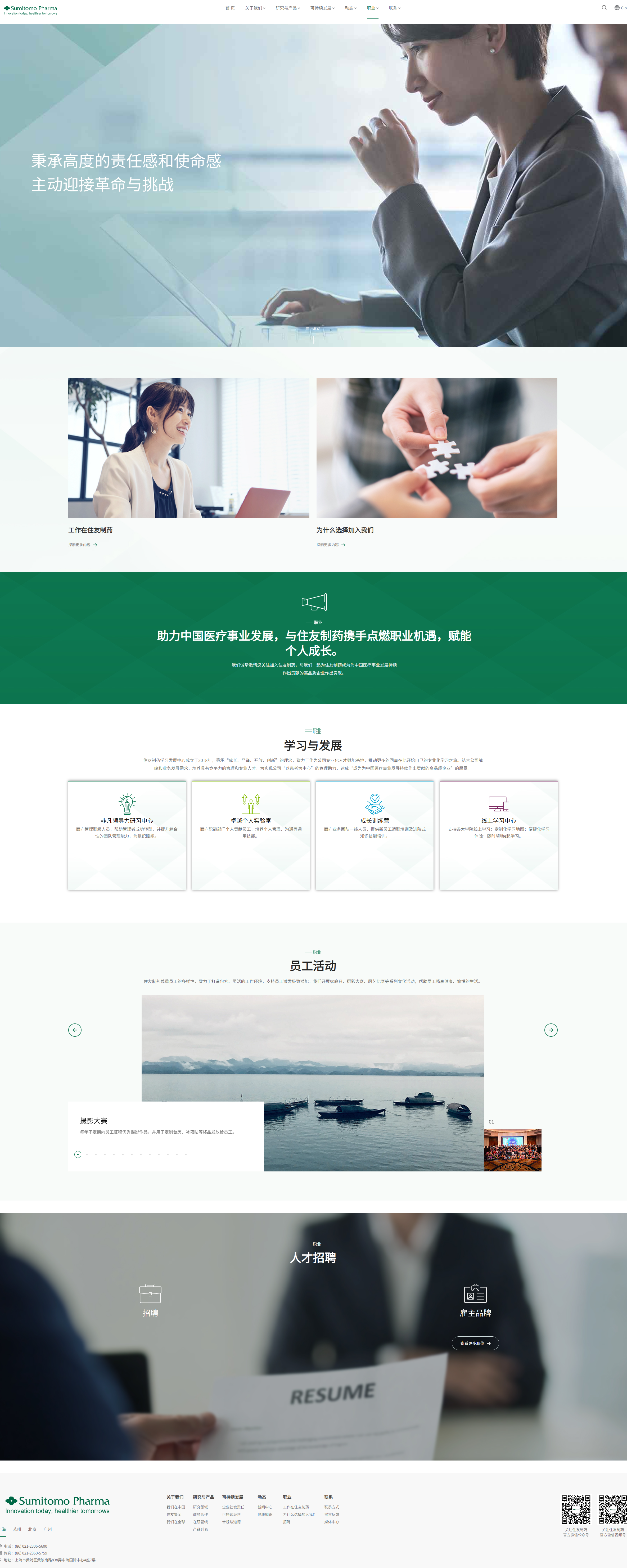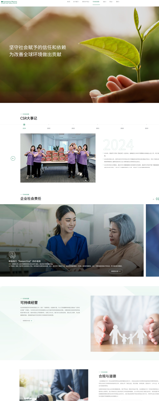 住友医药官网以专业、关怀、创新和国际化为核心风格定位。设计上,以深绿色为主色调,传递出企业的专业性和严谨性,同时通过简洁大气的布局和清晰的导航,确保用户能够轻松获取信息。网站特别突出了“企业社会责任”板块,展示其在教育、环保、灾害救助等领域的公益活动,体现了对社会的深切关怀。
