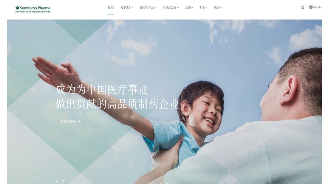 住友医药官网通过视觉、交互、情感三个维度的精心设计,提升了品牌感知。视觉上,深蓝色主色调与浅紫色搭配,营造出专业且温馨的氛围,高质量图片和视频直观展示企业实力与社会责任感。交互方面,简洁直观的导航和响应式设计确保便捷性,动态元素增强用户参与感。