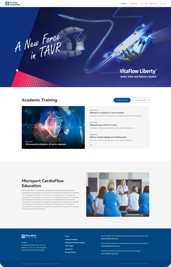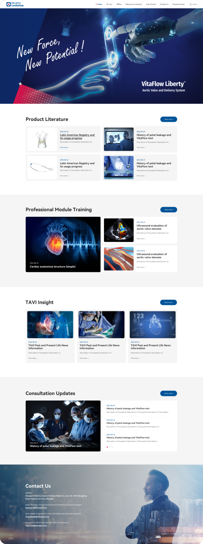 微创心通网站风格定位聚焦专业信赖与人文关怀,强调科技创新与产品安全有效。设计简洁明了,便于用户快速获取信息。色彩搭配以深蓝为主,辅以红白黑,展现稳重与活力。内容覆盖专业用户与患者需求,提供详尽产品资料与疾病知识,构建全方位、多层次的在线交流平台,体现微创心通在心脏瓣膜领域的专业实力与人文关怀。