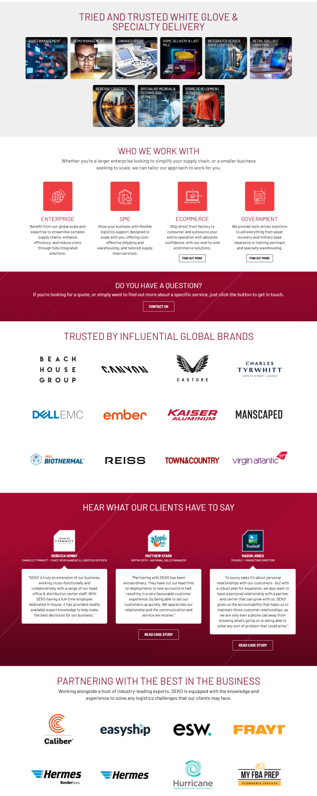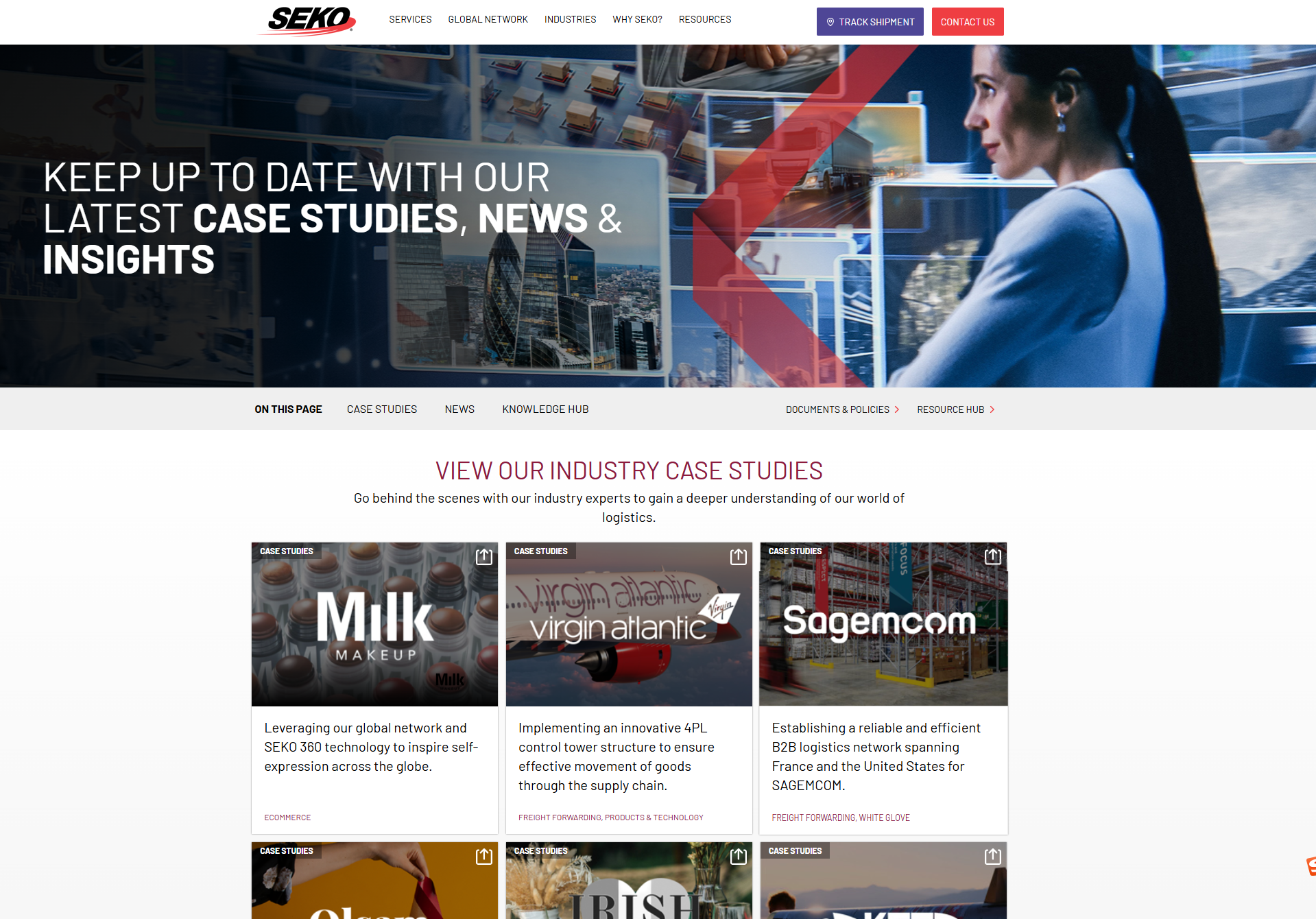 SEKO Logistics的网站针对不同类型的客户群体进行了精准定位。在首页上突出了时尚零售、电子商务、医疗、高科技等重点服务领域,便于相关行业的客户快速找到适合自己的解决方案。同时,网站还提供了客户案例、行业资讯等内容,帮助客户更好地了解SEKO Logistics的服务实力和行业影响力。