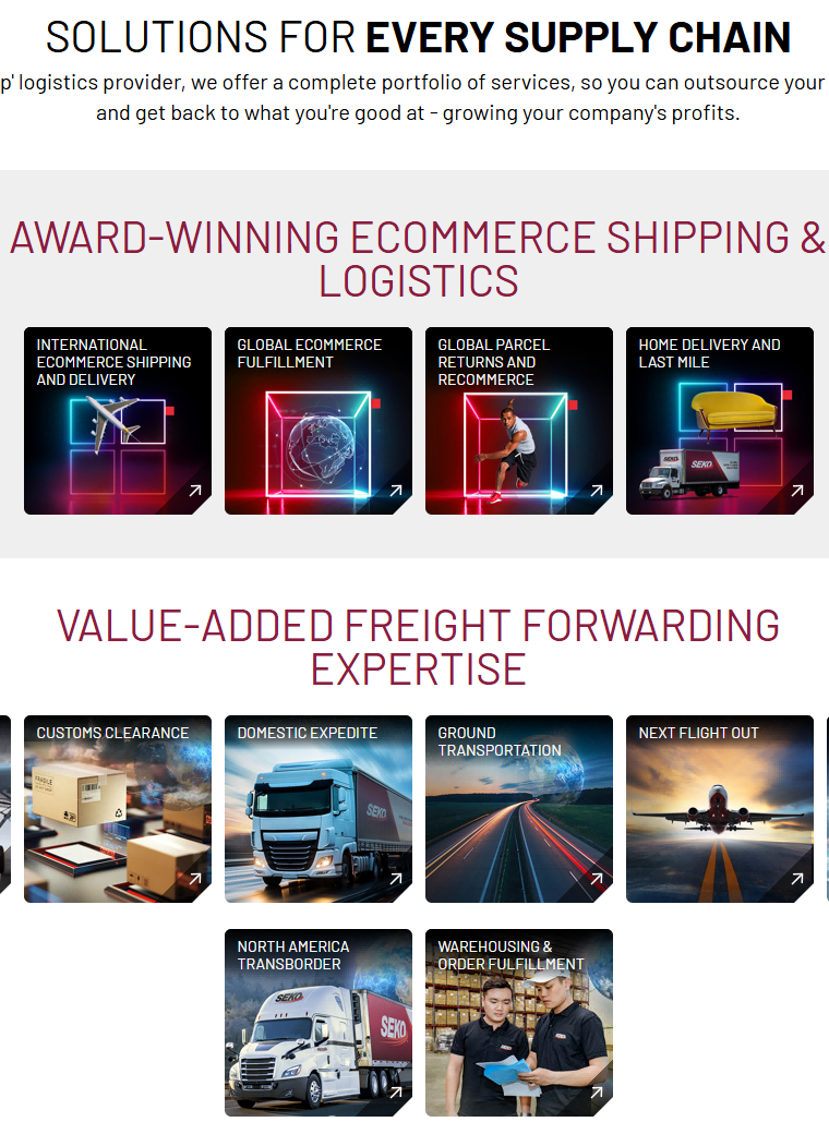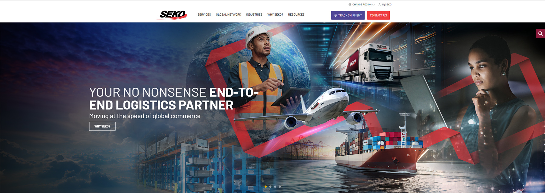 SEKO Logistics的网站采用了简洁、专业的色彩搭配。主色调以蓝色和白色为主,蓝色象征着专业、可靠与信任,白色则给人以简洁、清晰的感觉。这种色彩搭配不仅提升了网站的整体美感,也符合SEKO Logistics作为专业物流服务提供商的品牌形象。