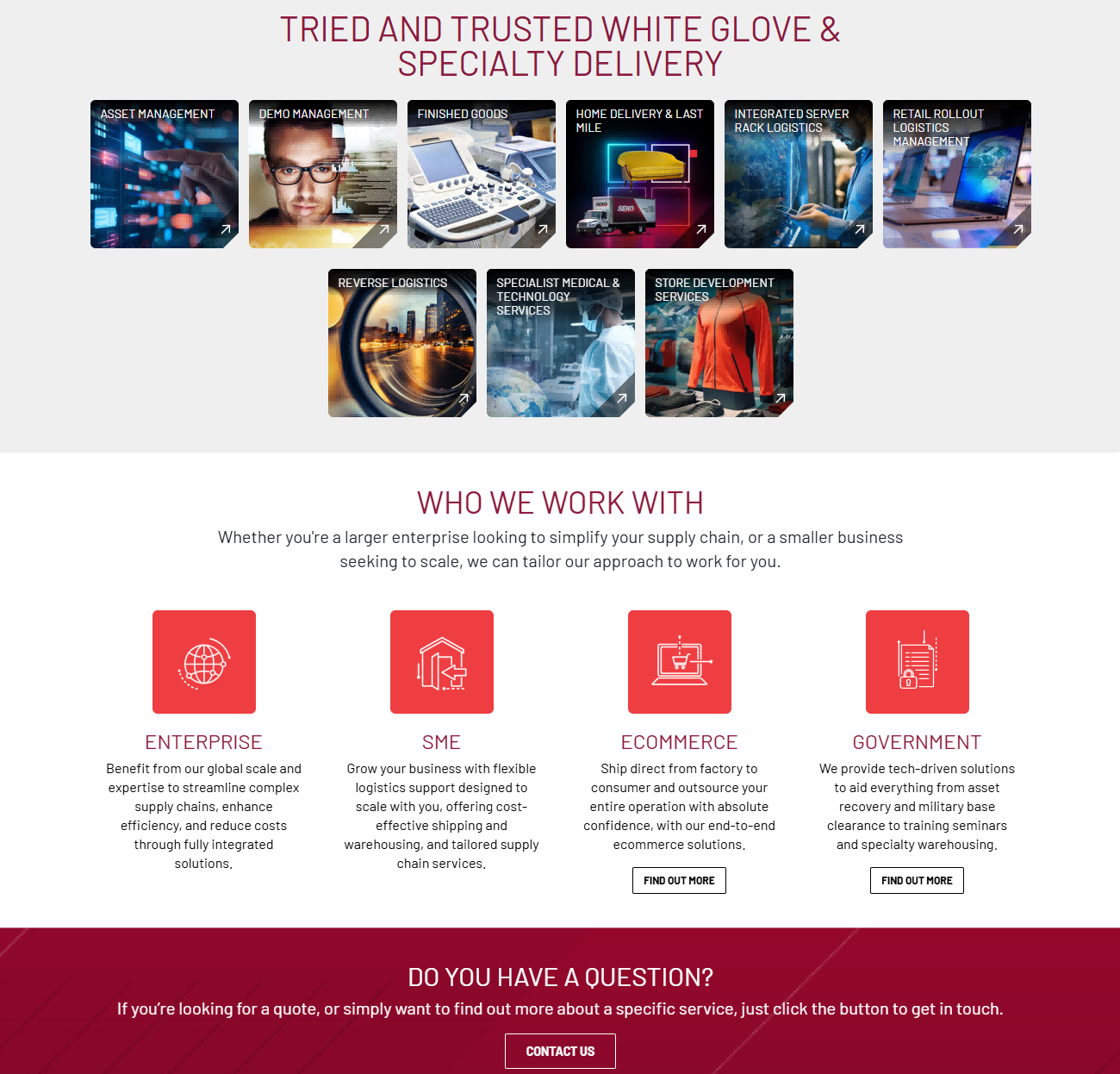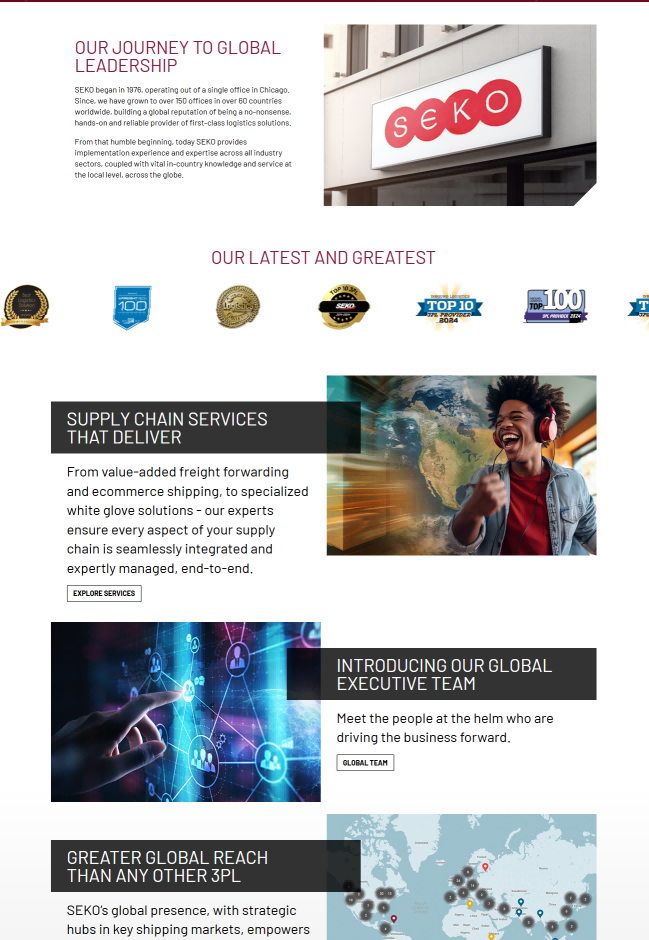 信息丰富:网站提供了详细的服务内容、行业解决方案、客户案例等信息,便于客户快速了解SEKO Logistics的服务优势。布局清晰:网站布局合理,导航栏清晰明了,方便用户快速找到所需信息。视觉效果好:网站采用了高质量的图片和动态效果,提升了用户的视觉体验。
