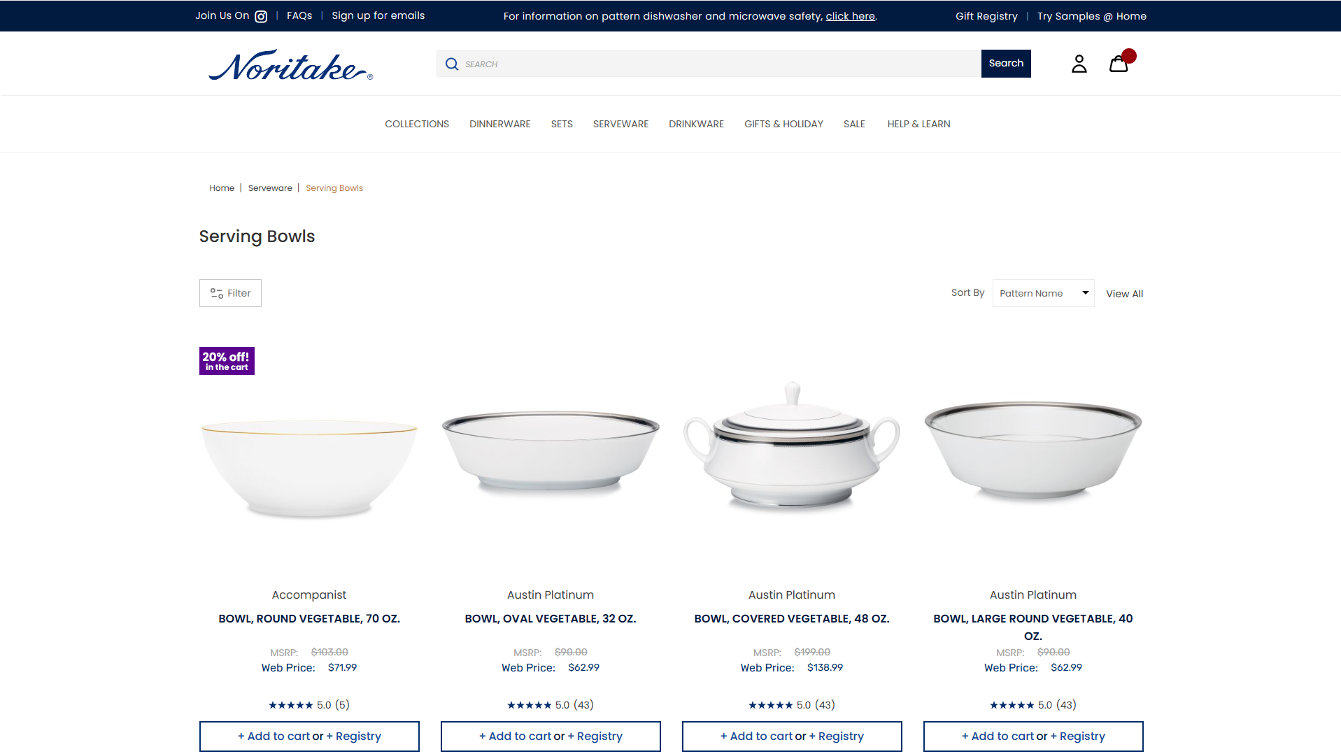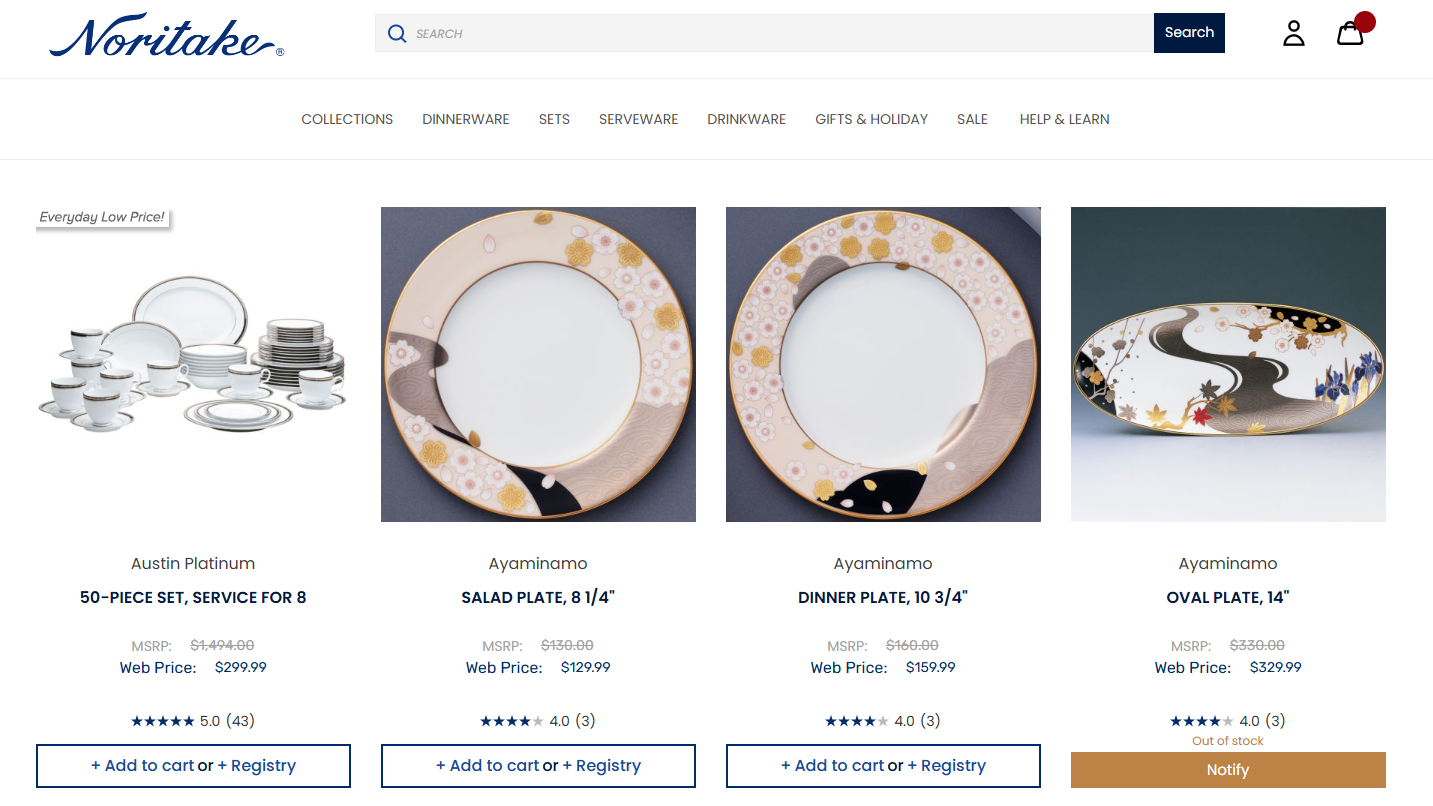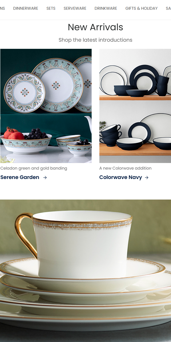 视觉方面:产品图片拍摄精美,多角度展示餐具的外观和细节,在白色背景的衬托下,餐具的质感和设计得以充分体现,提升了品牌的高端形象。页面布局简洁大方,产品分类和促销信息的排版整齐有序,使用户在浏览过程中感受到舒适和专业。交互方面:点击产品图片或名称可进入详细页面查看更多信息,操作流畅。购物流程较为简洁,添加到购物车和结算的按钮明显,方便用户进行购买操作。然而,缺乏产品搜索功能,当用户有特定产品需求时,可能需要花费较多时间在众多产品中查找。