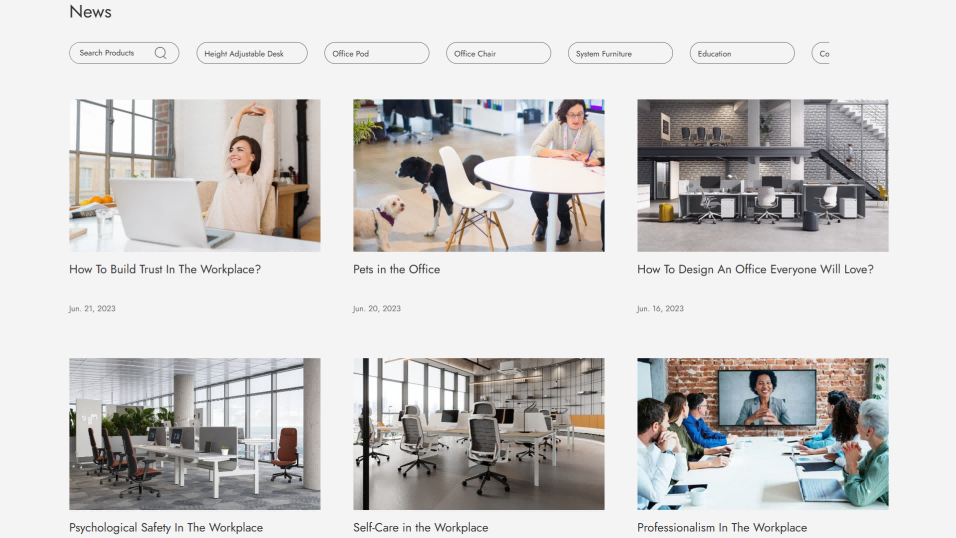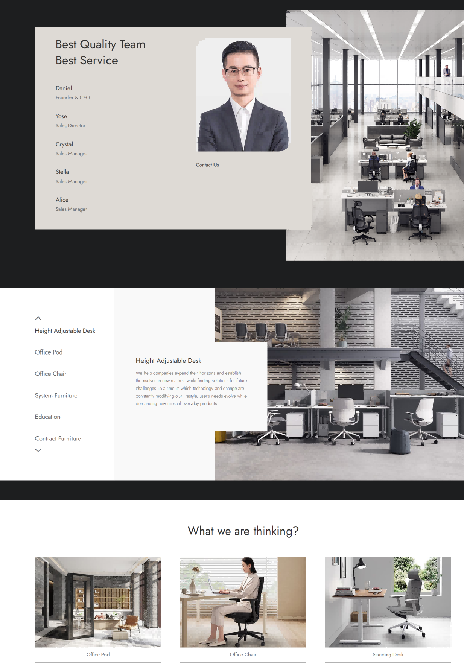 整体风格简约现代、专业务实。布局简洁清晰,首页以产品类别导航和重点产品展示引导用户浏览。产品页面注重图片展示与功能描述,文字简洁精准。整体设计围绕办公场景与用户需求展开,突出产品实用性与设计感,摒弃过多繁杂装饰,为用户打造高效、舒适的浏览体验,增强用户对品牌的信任与好感。